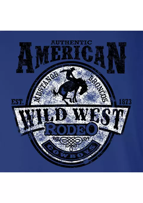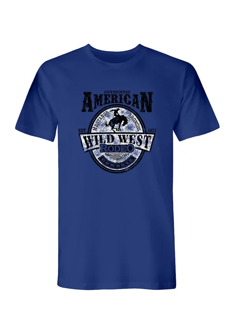 Cool American Wild West graphic tee shirt. Statement royal blue color. Comfortable cotton, perfect fit.