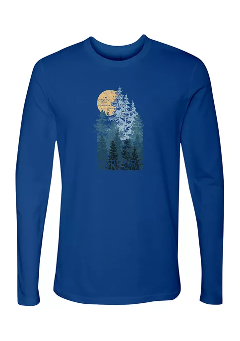 Let’s take a hike and explore the trees graphic long sleeve tee shirt. Comfortable cotton. Perfect fit. Cool blue color.