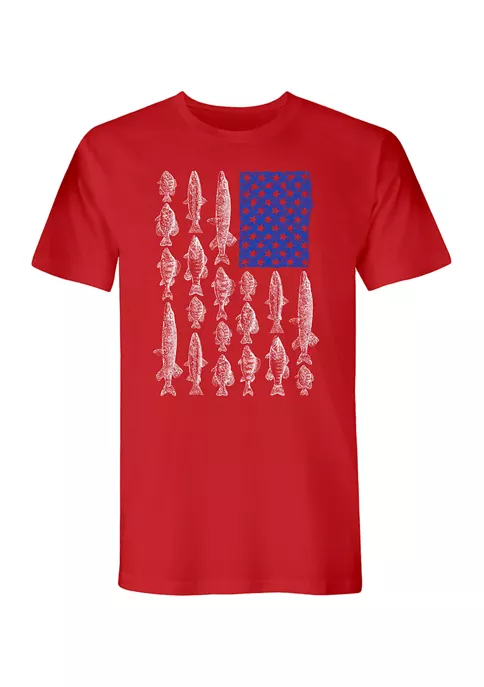 Americana fishing shirt shouts red, white and blue. Graphic print cotton tee shirt. Comfortable cotton, perfect fit.