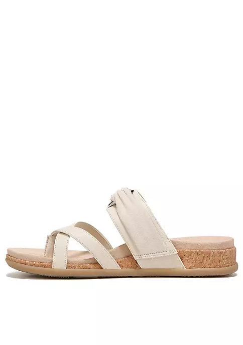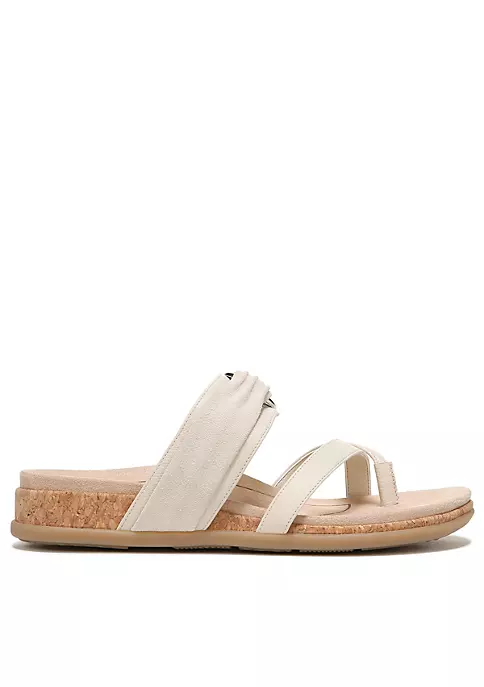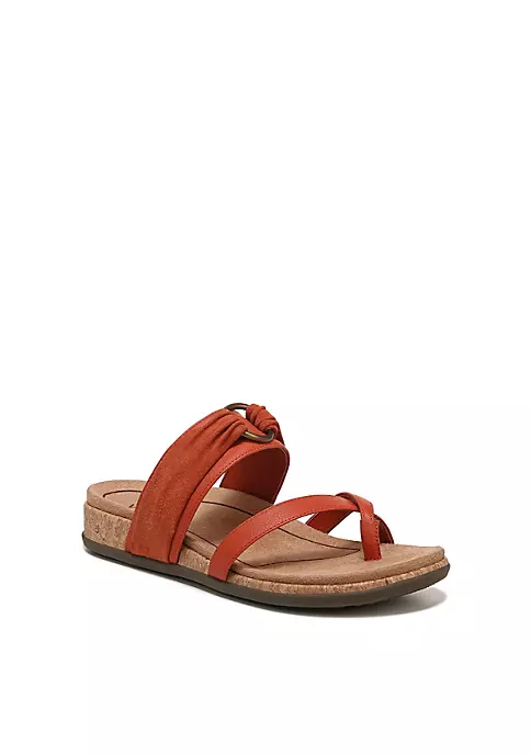 With suede-overlayed O-ring bling, this leather-strap beauty flaunts a criss-cross toe loop, and a supportive cork-wrapped sole.